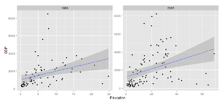 geom_smooth(method="lm") + xlab("Education") + ylab("GDP") +